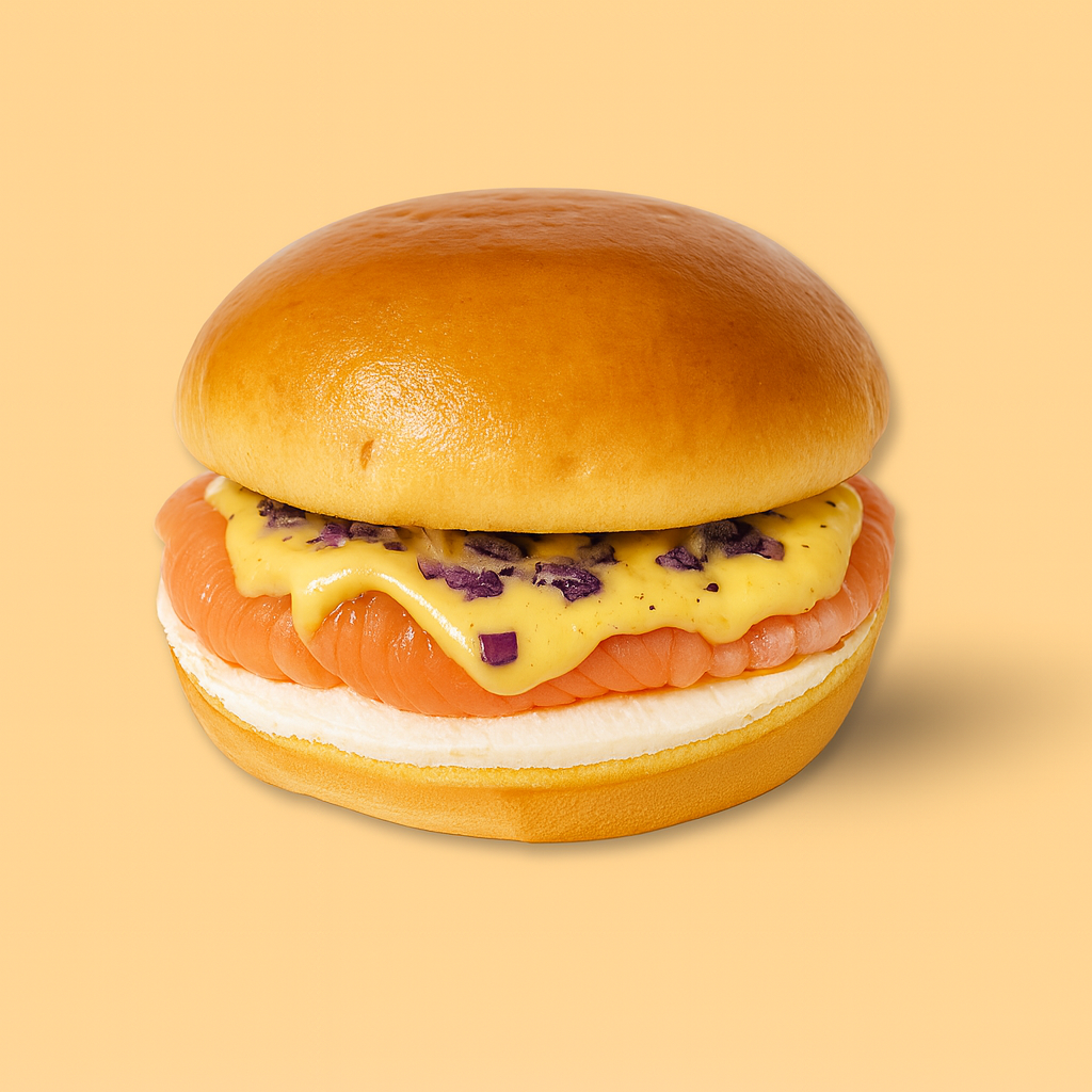 Salmón noruego, queso crema suave, cebolla roja y miel-mostaza. King Solomon llega, mira y conquista.