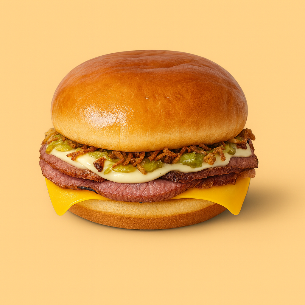 Lonchas de pastrami con carácter, cheddar fundido, pepinillos y cebolla crujientes y su mezcla deliciosa de mayo-mostaza. “Rico always delivers.”