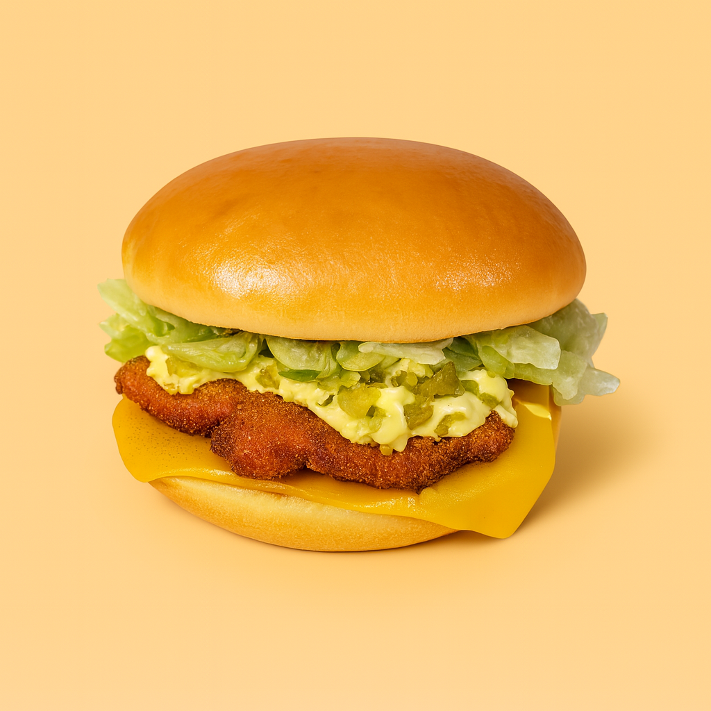 Pollo empanado crujiente, cheddar fundido, lechuga fresca, pepinillos y mayo-mostaza. El Criminal del Crujiente.